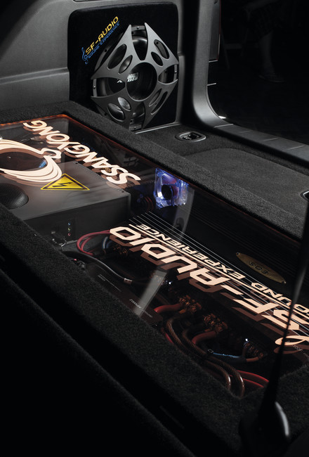 Для системы подобного уровня нужен самый музыкальный сабвуфер – поэтому лишь закрытый ящик, никаких фазоинверторов. Объем корпуса примерно 20 литров, сделан по технологиям «фанерный стелс» и напоминает очертаниями кобру большого маузера, которая установлена в нише заднего правого крыла под облицовкой. С наружной стороны виднеется лишь фальшпанель квадратной формы с защитной решеткой и динамиком. Головка сабвуфера – Sundown audio SD-2 10D4, включение обмоток последовательное с результирующим сопротивлением 8 Ом. Согласитесь, что выбор динамика для традиционных жанров немного неожиданный, однако вполне оправданный для подобного большого салона. А увеличенным сопротивлением обеспечивается хорошее демпфирование.